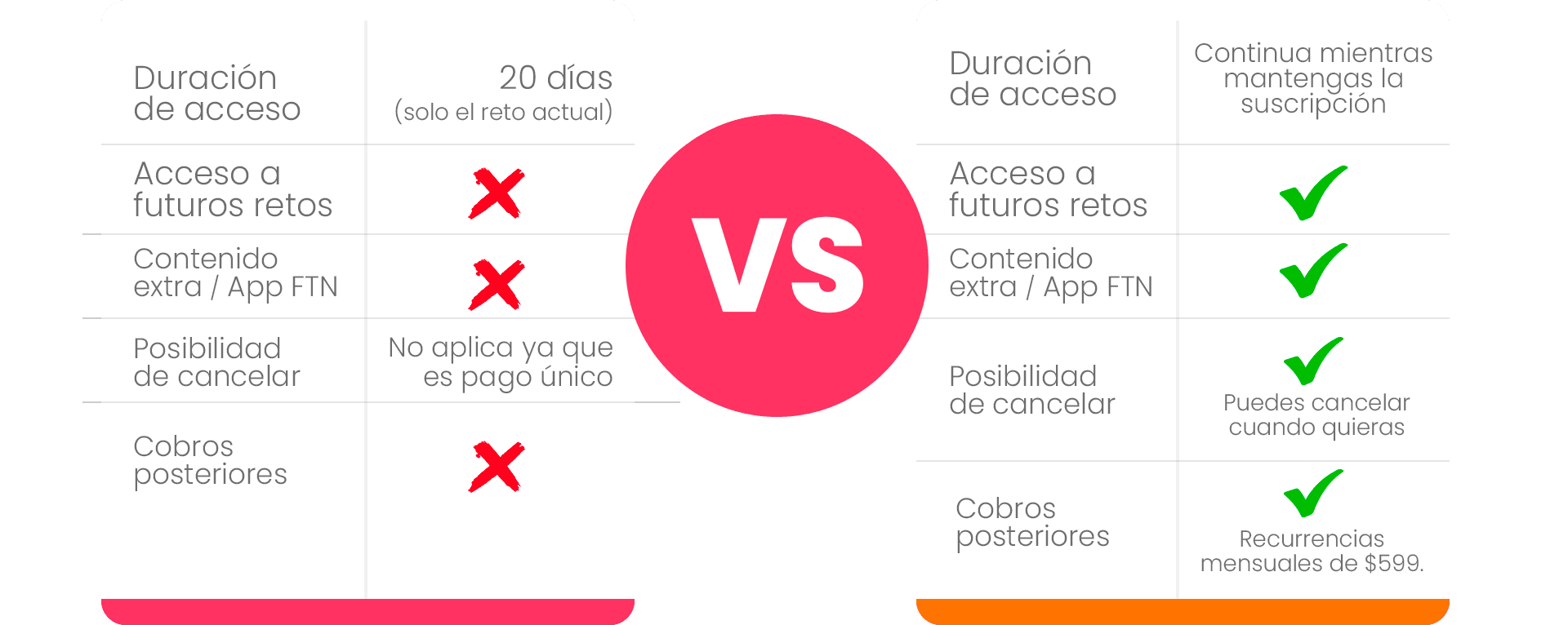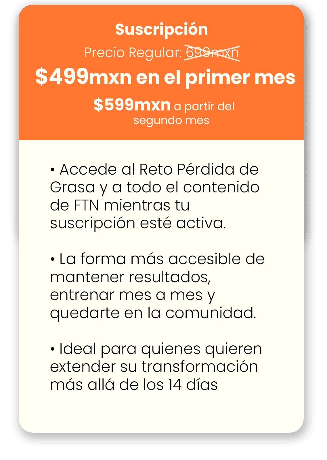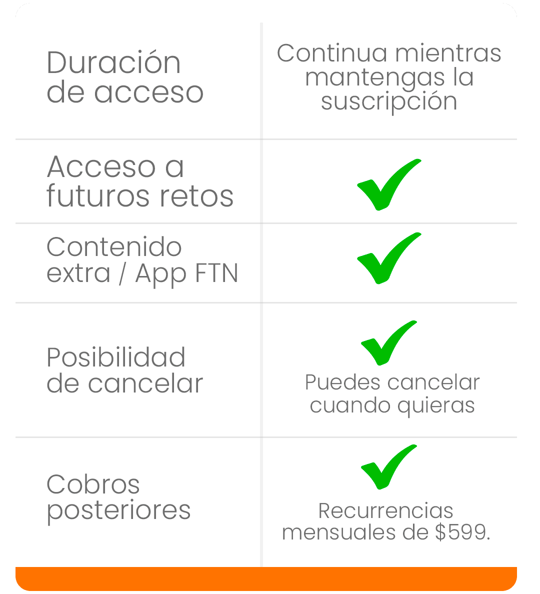 - Suscripción: $499mxn el primer mes, luego $599mxn/mes · Acceso continuo a FTN y a todos los retos activos y futuros. Cancela cuando quieras.