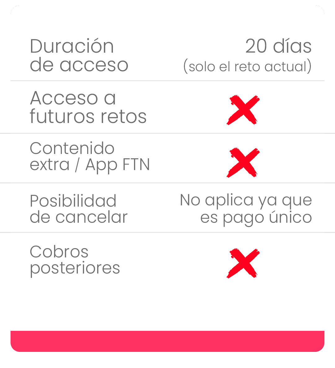 Acceso completo al Reto + todos los materiales incluidos. Duración de acceso: 20 días a partir de que comienza el reto. Sin cobros posteriores.