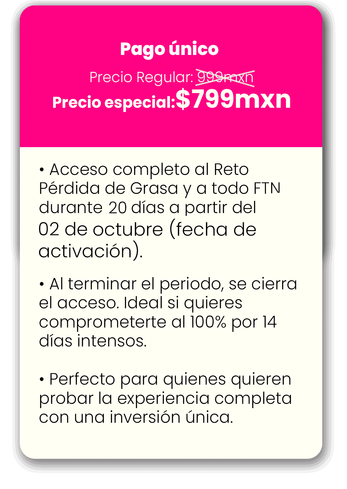 - Pago único: $799mxn (antes $999mxn) · Acceso total al reto durante 20 días. Sin cobros posteriores.